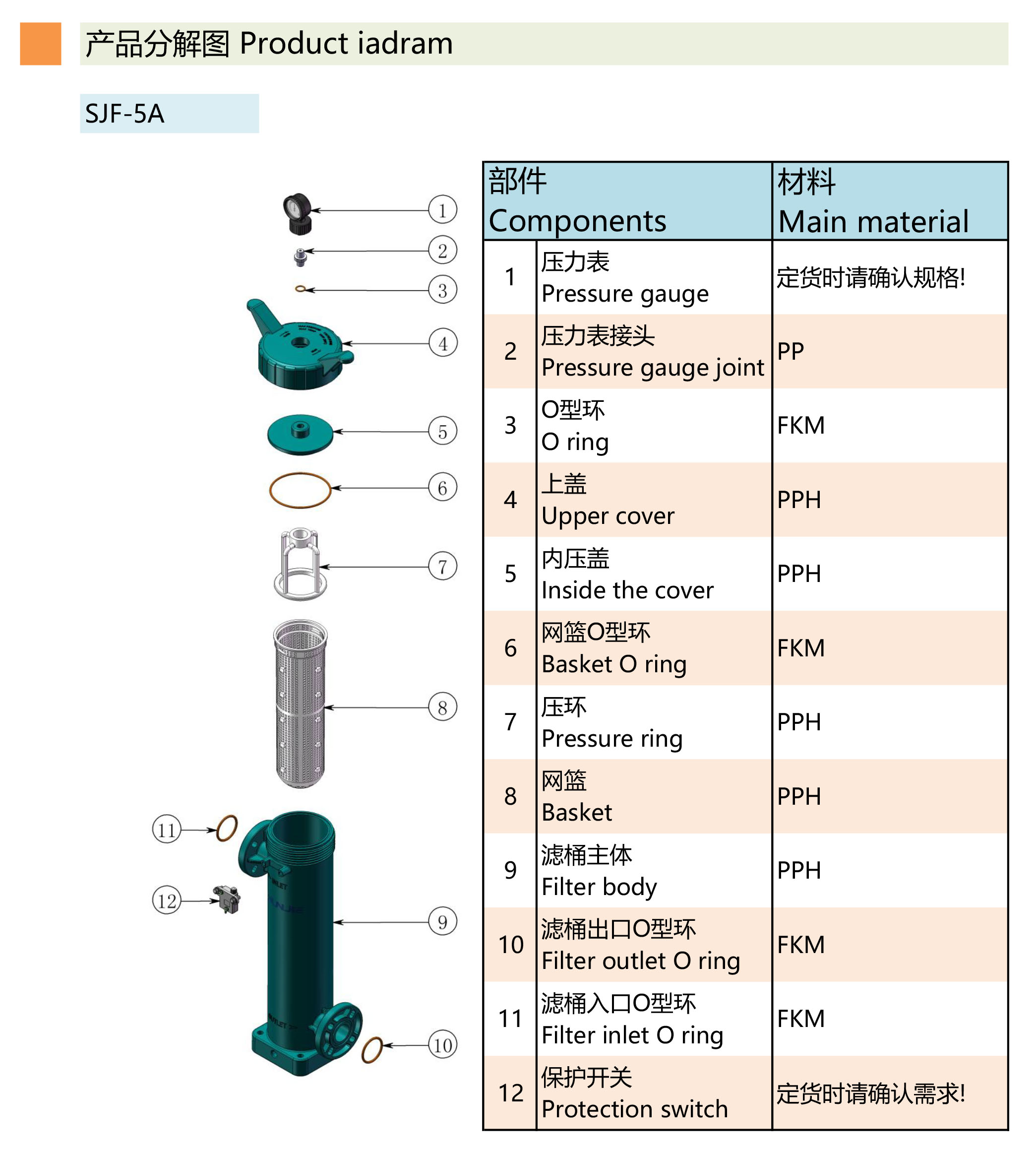 SJF-5A-50产品特点: ●此过滤器为滤袋式过滤器,配标准5#过滤袋(φ150*510MM)。也可改装成20″*3芯的滤芯式过滤器。 ●此过滤器是按国际通用标准设计制造的,能与国际知名品牌(如EATON、FSI、PALL等)的滤袋相匹配,也能与国内标准滤袋相匹? ? ? ? 配。 ●桶体采用一体成型设计,结构坚固可靠,无任何焊接点,彻底解决漏液之虑。 ●重量轻,进口PPH原料一体成型,对绝大多数化学品具有很好的抗腐蚀性能。可定制PVDF/ETFE/PFA材质。 ●含有防紫外线材料,使其经久耐用,且适合各种气候下使用。 ●旋拧上盖的设计使其无需任何工具就可以打开和关闭滤桶,更换过滤袋方...